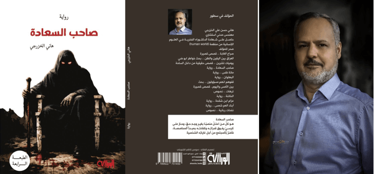 أما الغلاف، فهو من العتبات النصية أيضا، وفيه صورة لشخص يرتدي ملابس سوداء، لا يظهر منه سوى عينين تقدحان شررا، وهو جالس على كرسي في إشارة إلى الزعامة، ويمسك بيده عصا غليظة في دلالة على القوة. ويشكل الغلاف خطابا بصريا، لأن الصورة ترتبط ارتباطا وثيقا بالمتخيل. وفي الغلاف الآخر نجد هذه الكلمات التعريفية: {صاحب السعادة هو كل من احتل منصبا بغير وجه حق، وحاز على كرسي يفوق قدراته وكفاءته بمبدأ المحاصصة، فأضر بالمجتمع من أجل غاياته الشخصية}.